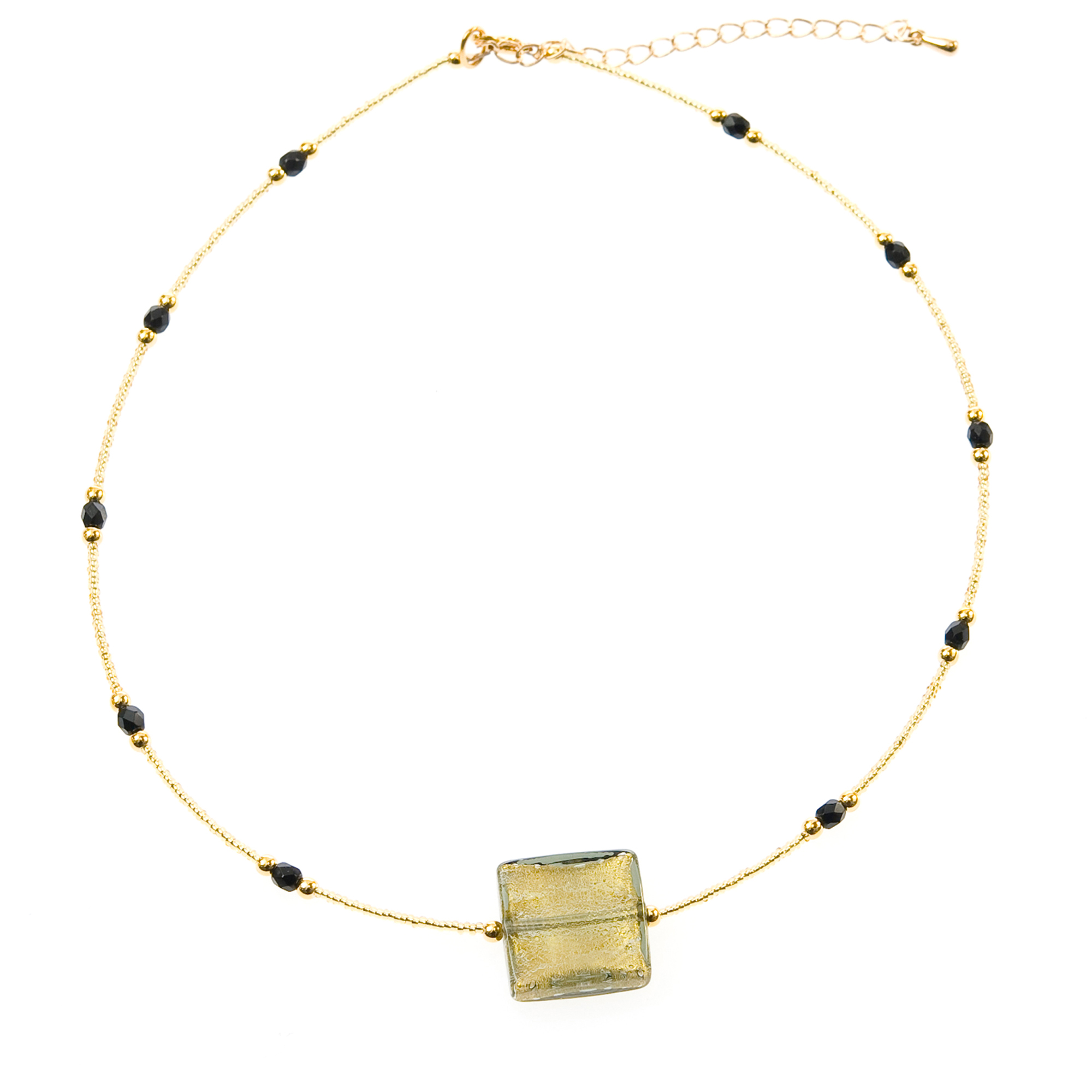 Das Collier besteht aus einem Murano Glas Quadrat in der Größe von ca. 20x20 mm und wird getragen von einer farblich abgestimmten Glasperlenkette. Durch die Unterbrechungen in der Kette mit edlen Swarovski Elements wird die Wertigkeit nochmal unterstrichen. Das Schmuckstück hat ein Gewicht von ca. 11 gr. und eine Länge von ca. 45 cm und eine Verlängerung von 6 cm.